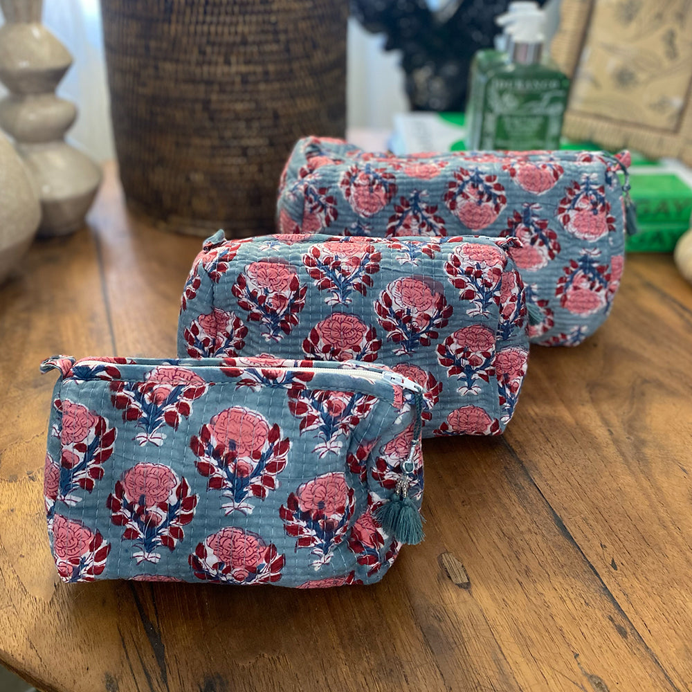 Available in three convenient sizes, these cosmetic pouches offer the ideal storage for makeup, toiletries, skincare, or small accessories. The soft quilted texture and unique hand-block prints make them a thoughtful gift for birthdays, holidays, or bridal parties.