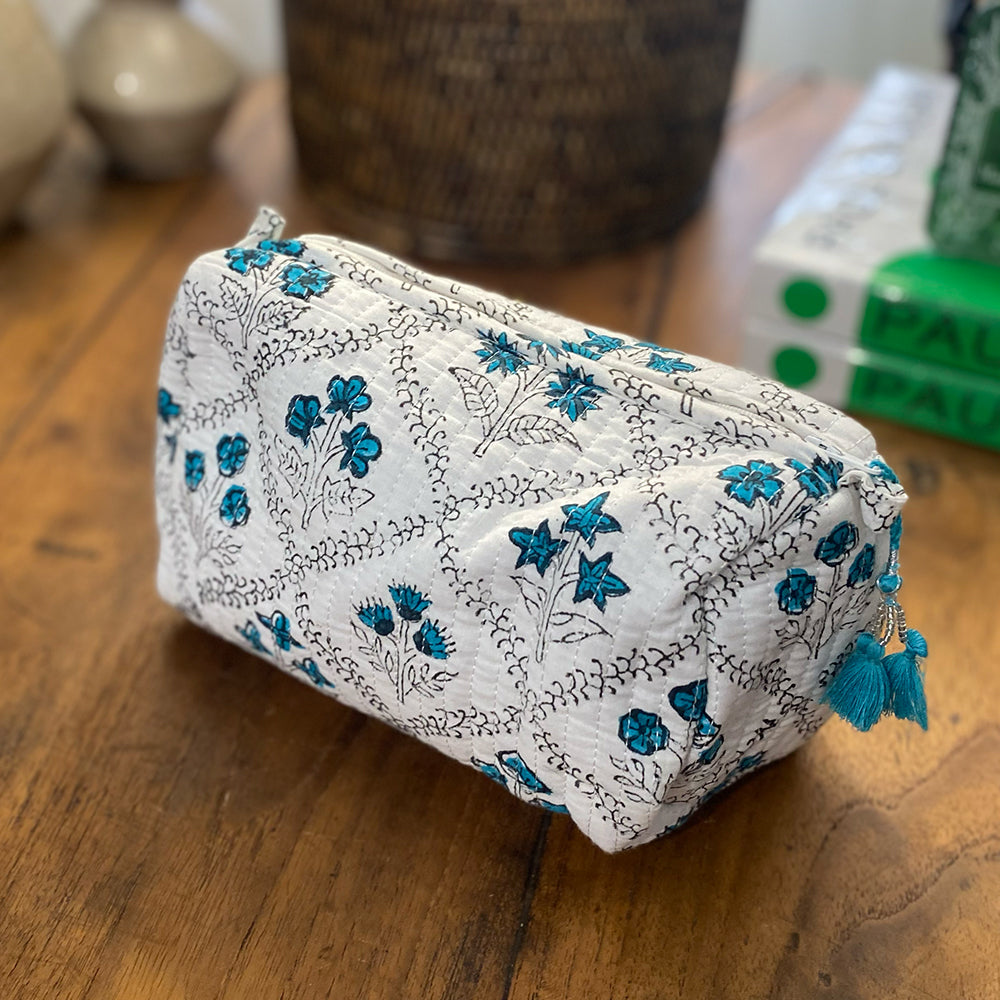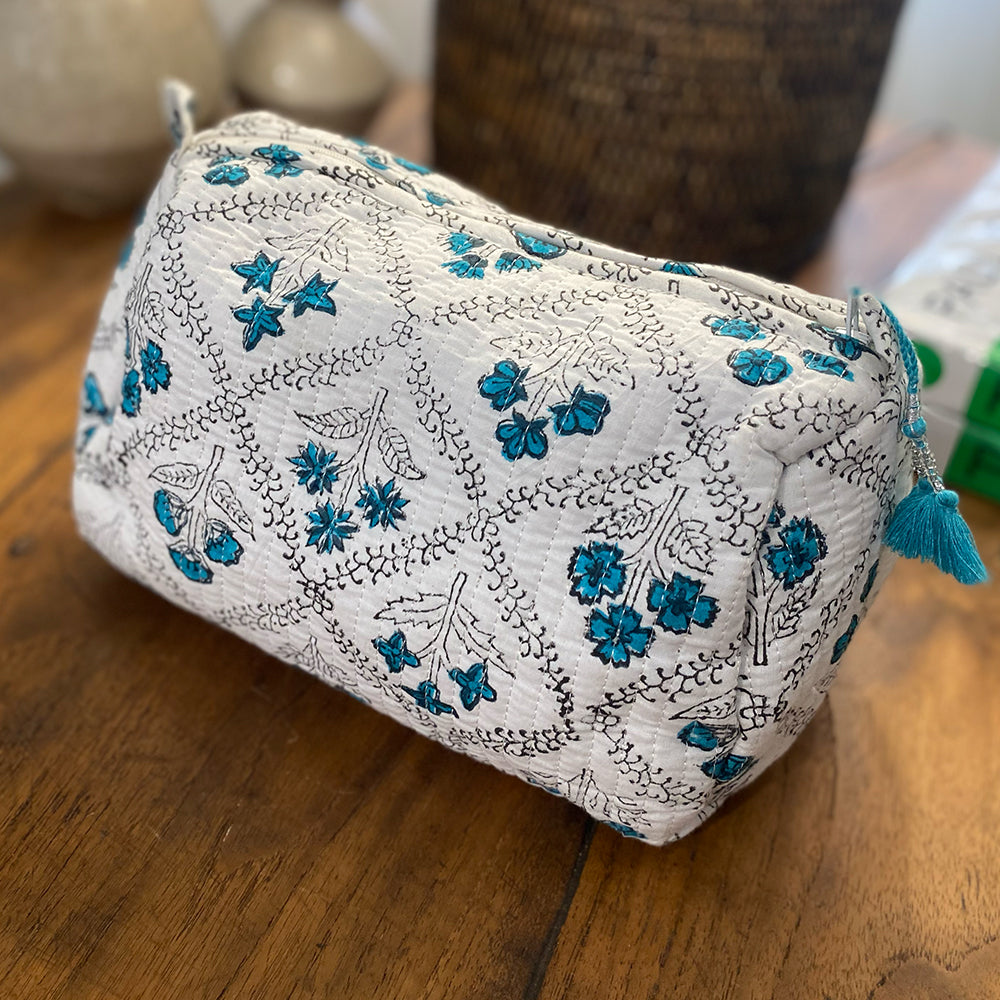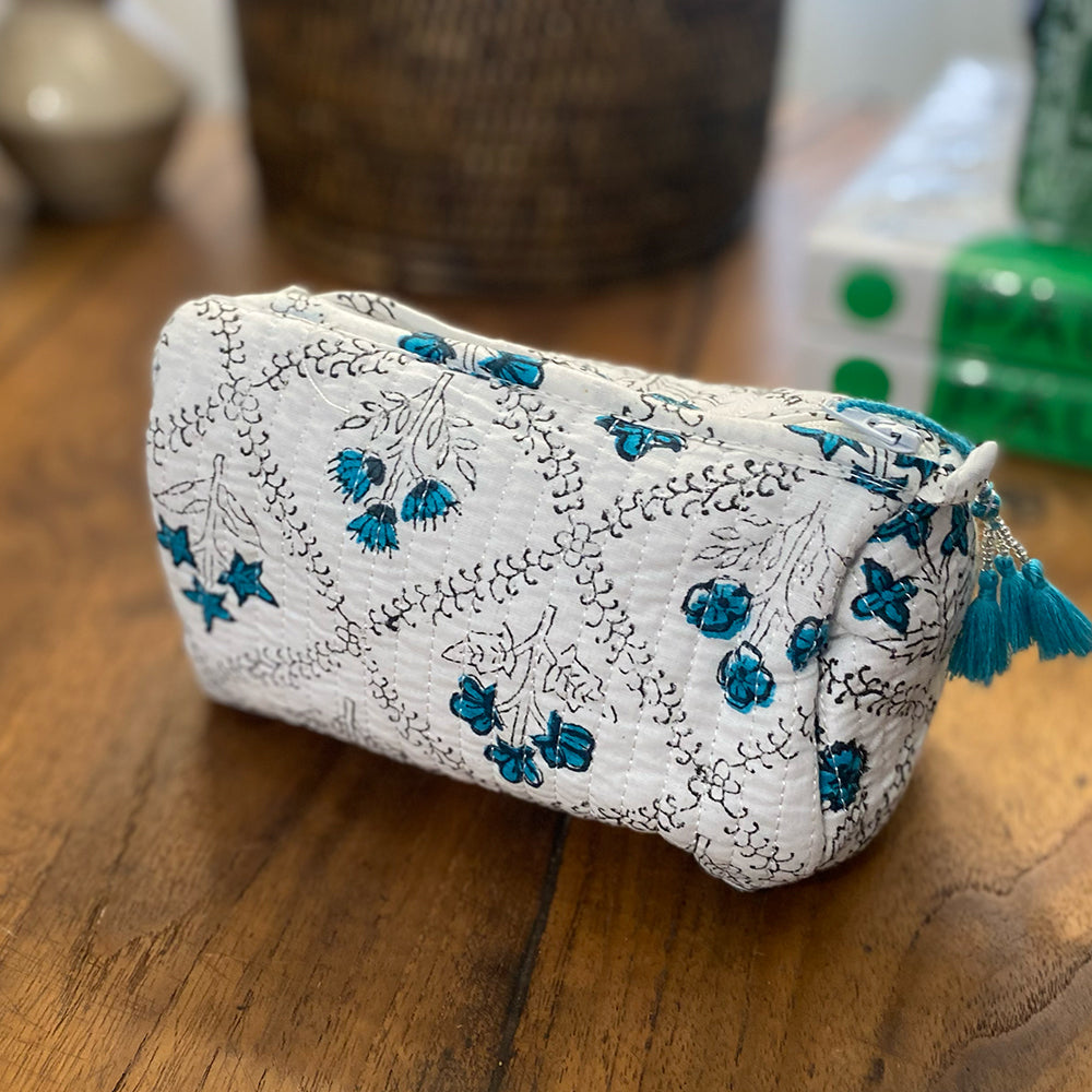 Available in three convenient sizes, these cosmetic pouches offer the ideal storage for makeup, toiletries, skincare, or small accessories. The soft quilted texture and unique hand-block prints make them a thoughtful gift for birthdays, holidays, or bridal parties.