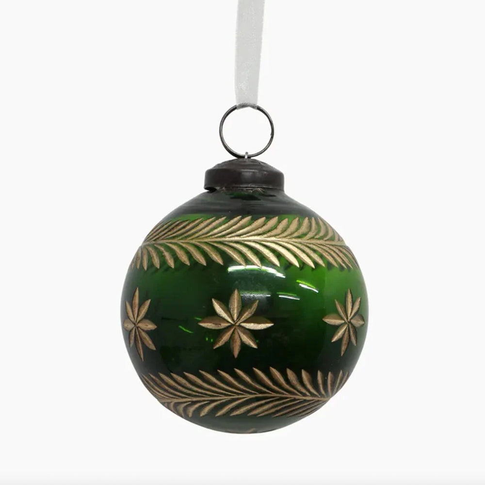 Our unique hand made glass Christmas baubles have a vintage etched pattern in green and gold. Each bauble is finished with a beautiful 10cm length of white organza ribbon.