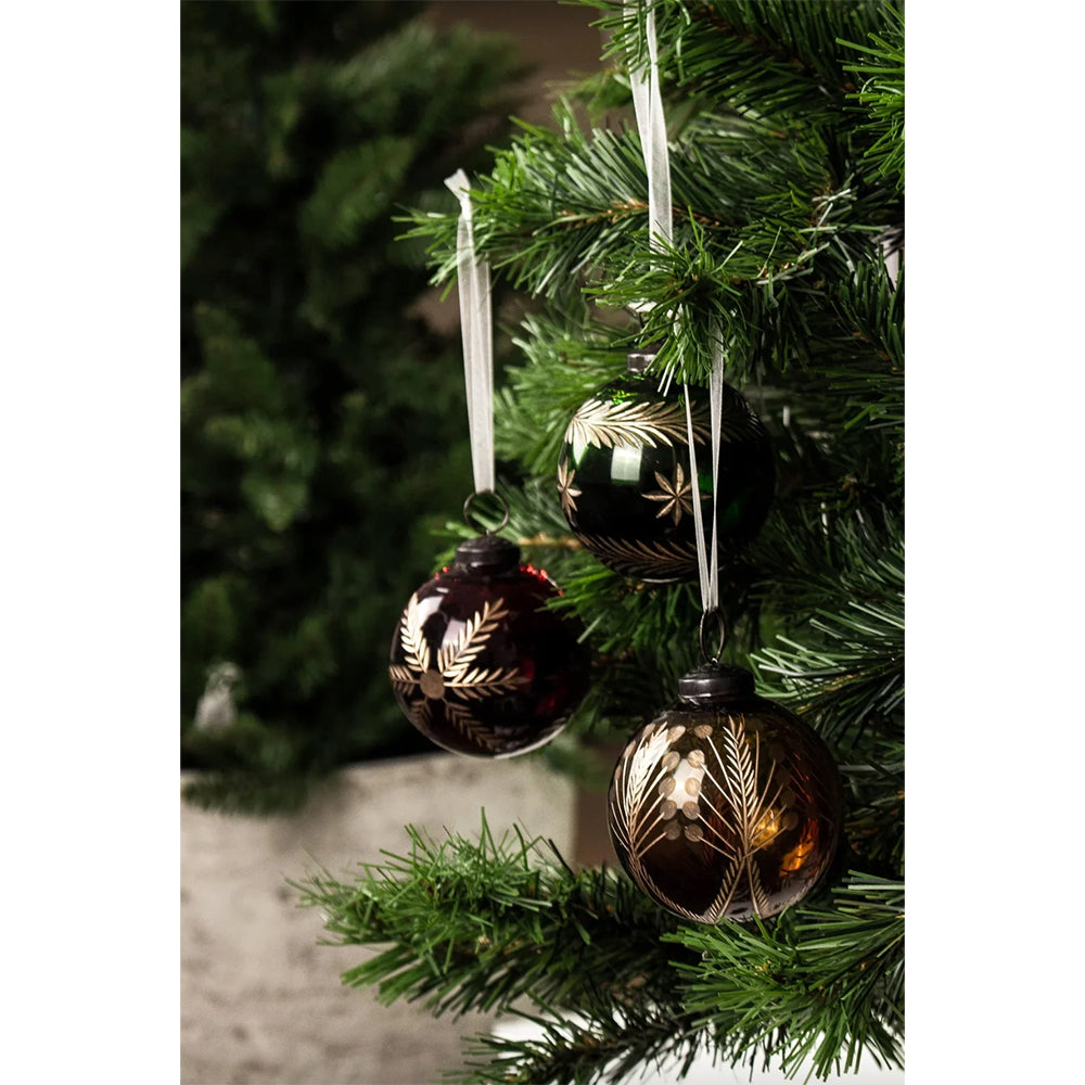 Our unique hand made glass Christmas baubles have a vintage etched pattern in red and gold. Each bauble is finished with a beautiful 10cm length of white organza ribbon.