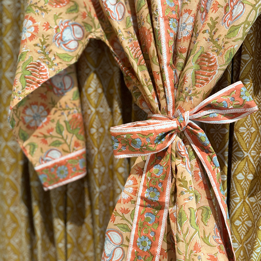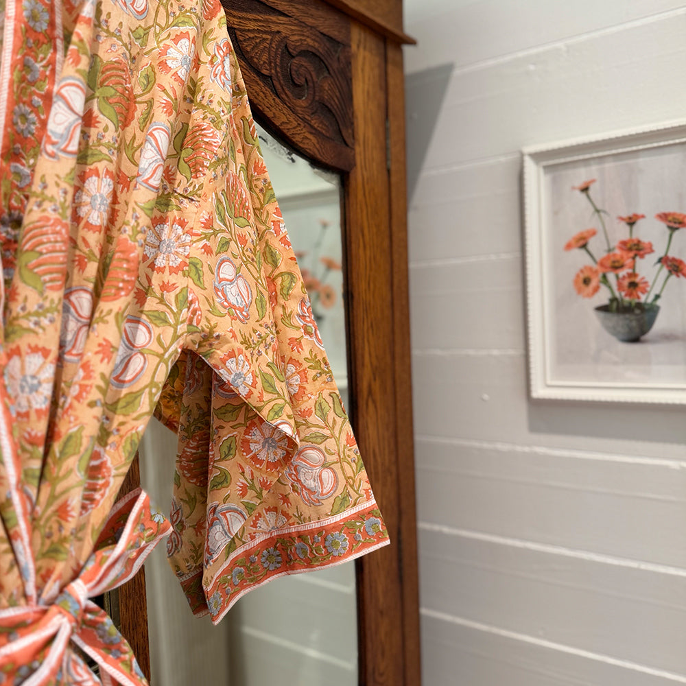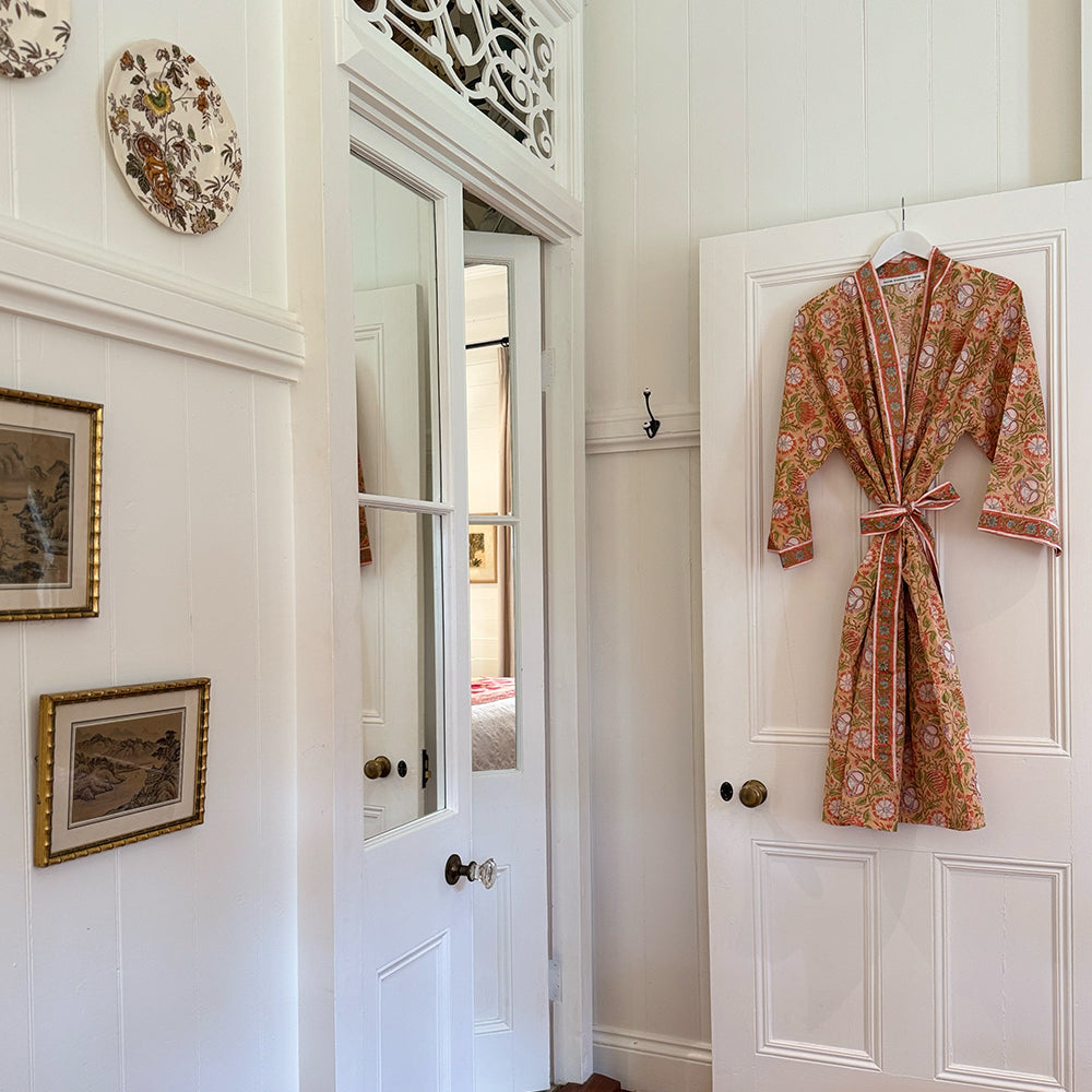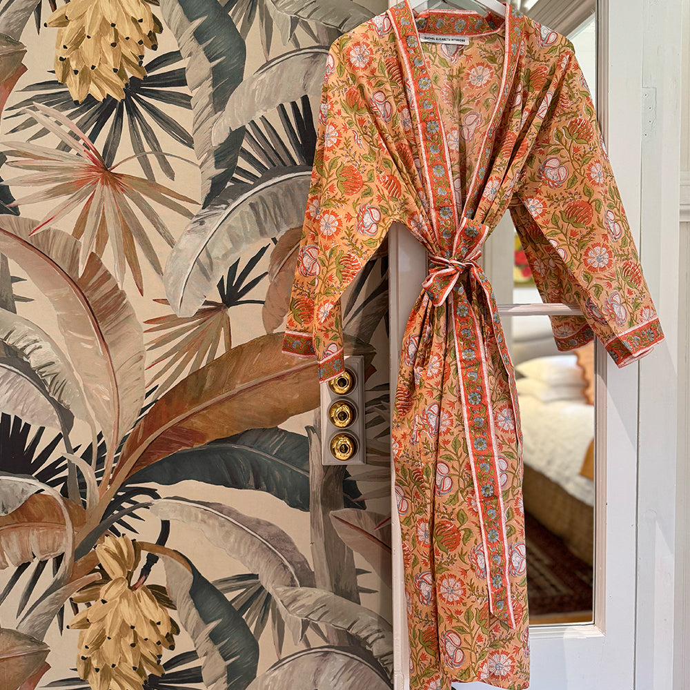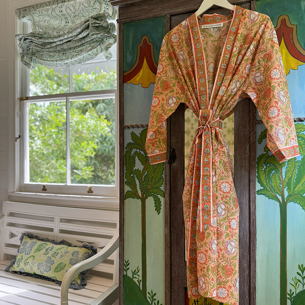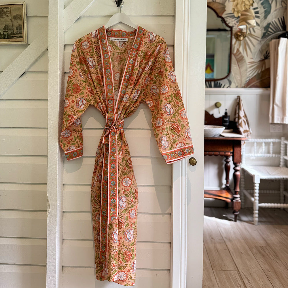 Introducing the Ophelia Kimono Robe, the newest addition to our signature Kimono Robe collection. Wrap yourself in effortless luxury with our hand block printed, kimono-style dressing gown, made from 100% organic, Fairtrade-certified cotton and designed exclusively by Rachel Elizabeth Interiors.
