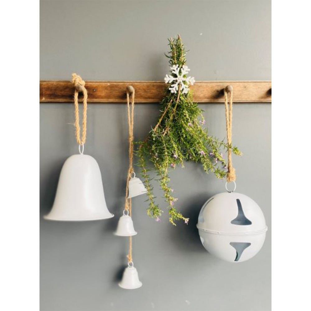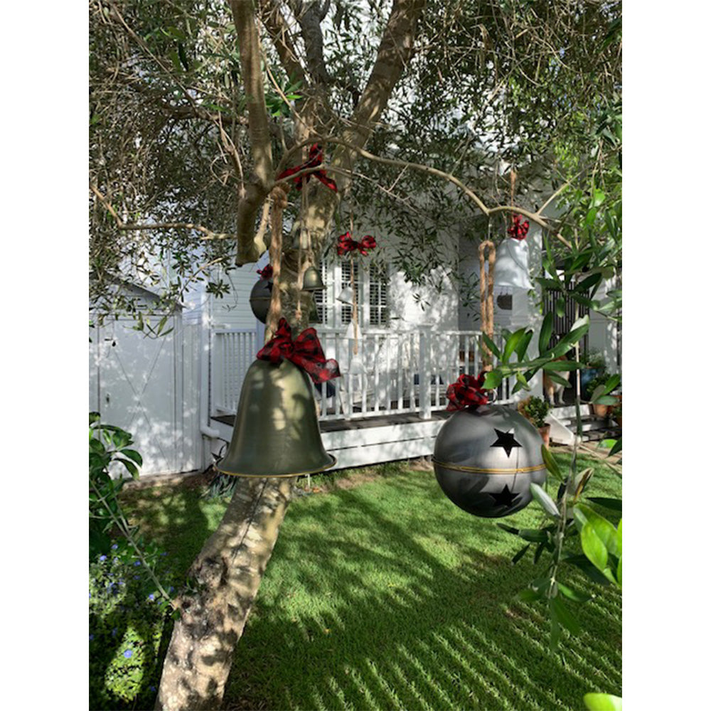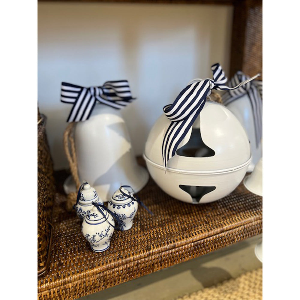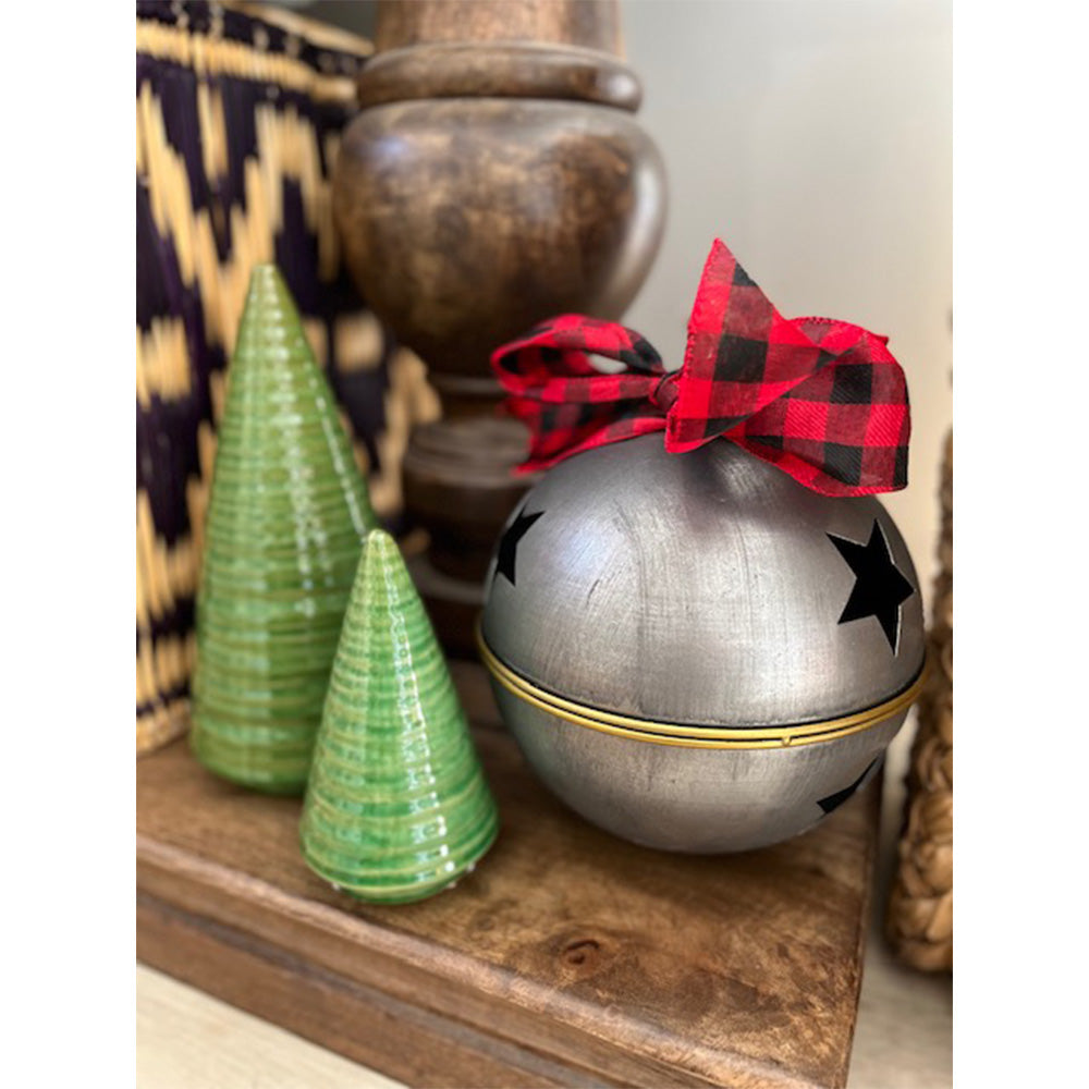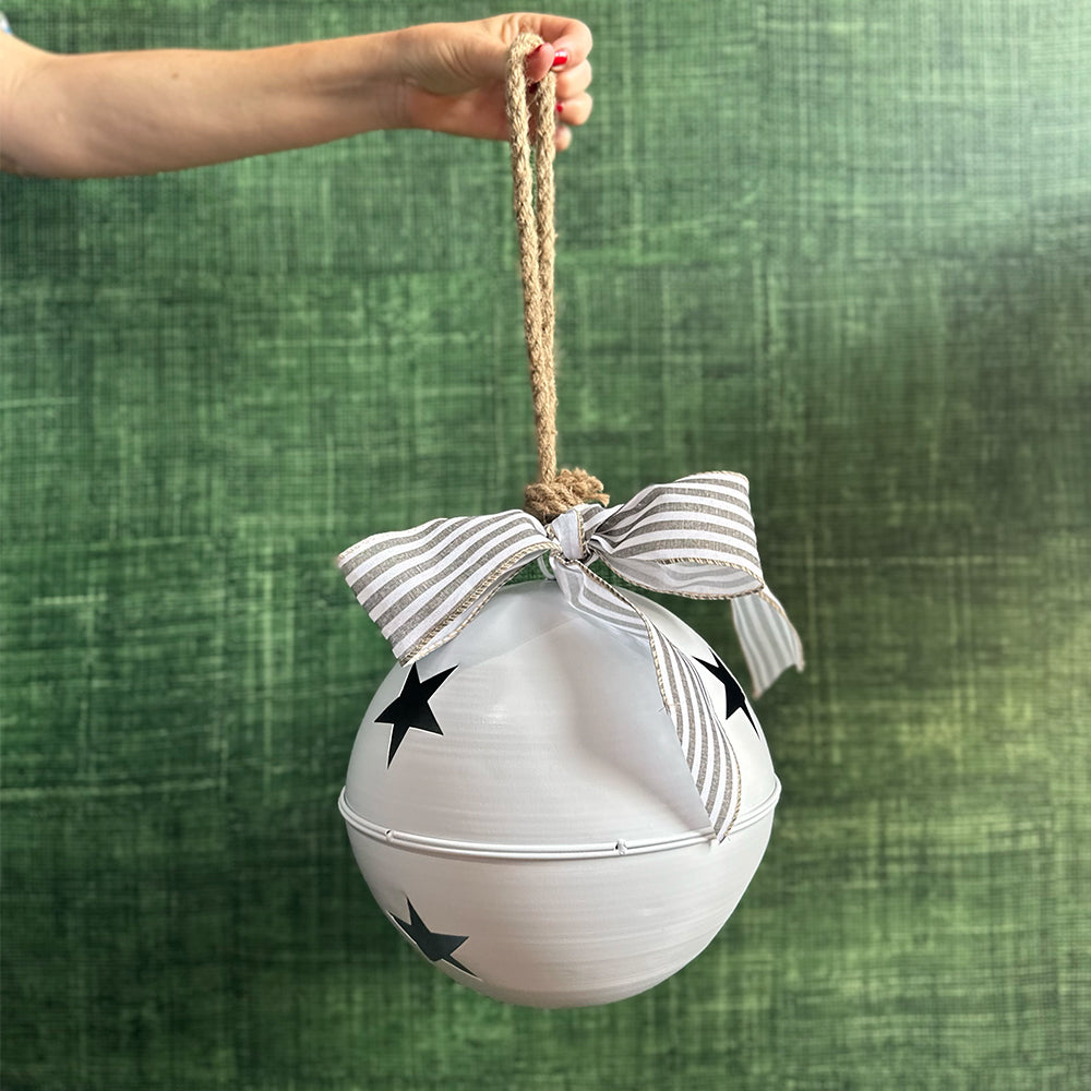 Christmas Bell with spherical shape, including a rope and ribbon to hang or jingle.